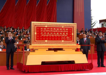 中共中央政治局常委、全国政协主席、中央代表团团长王沪宁向西藏自治区赠送习近平题词的“共建中华民族共同体,书写美丽西藏新篇章”贺匾。