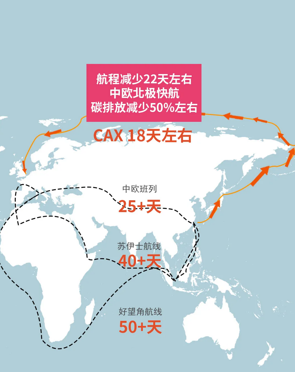 该航线取道北极东北航道,经白令海峡直达欧洲,单程18天左右,较传统航线缩短22天,碳排放量降低约50%。这是继宁波舟山港2024年底开通至德国威廉港的26天“中欧快航”后,再创中欧快航时效新纪录。